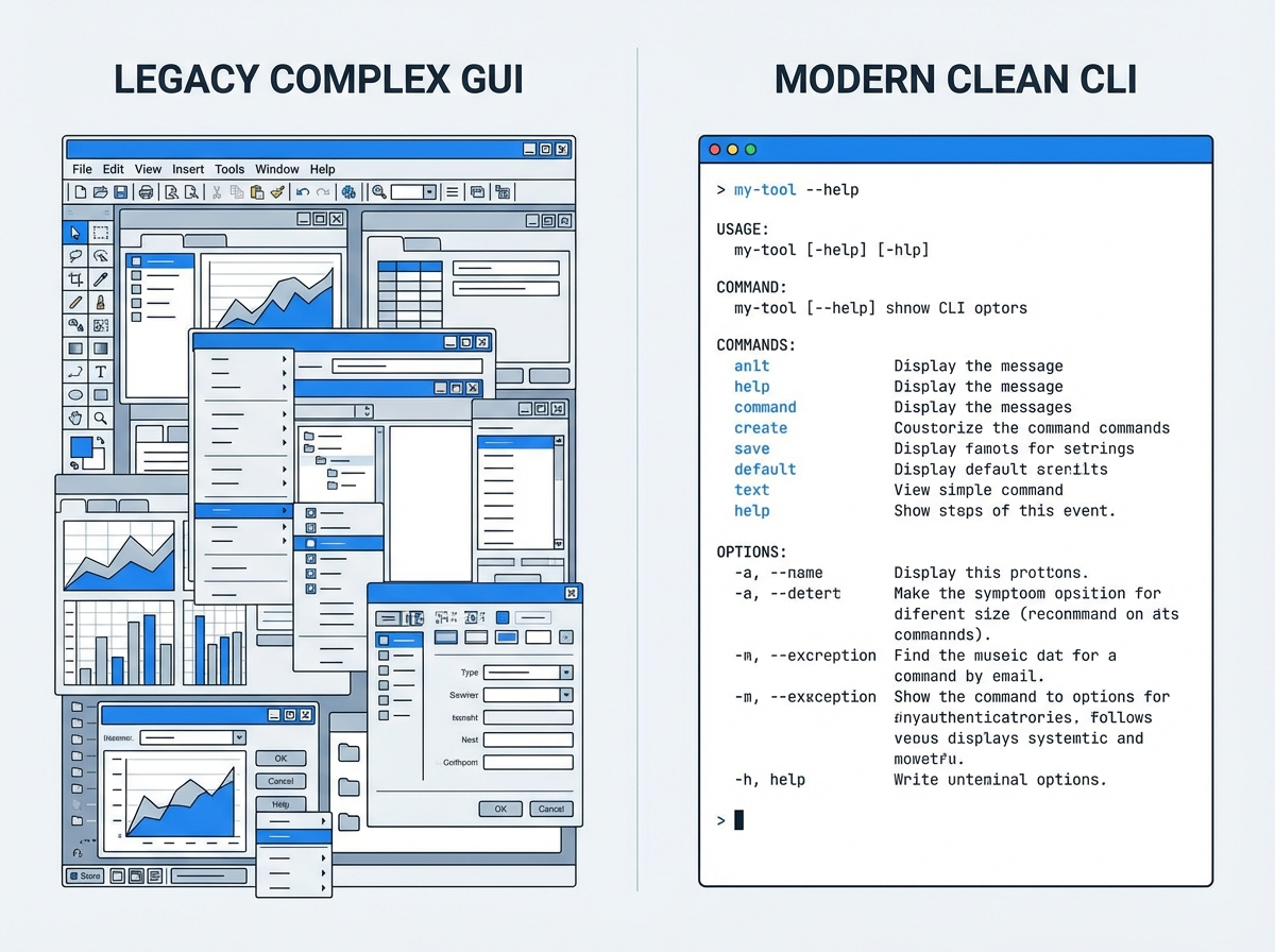 图 1:CLI vs GUI 对比 - 左侧是复杂的 GUI 界面,右侧是清晰的 CLI 终端,AI 能直接理解 CLI 的帮助文档。