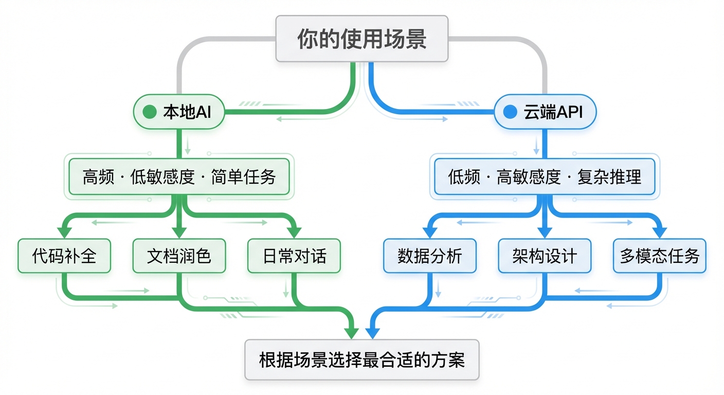 - 高频 · 低敏感度 · 简单任务 → 本地AI(代码补全、文档润色、日常对话)