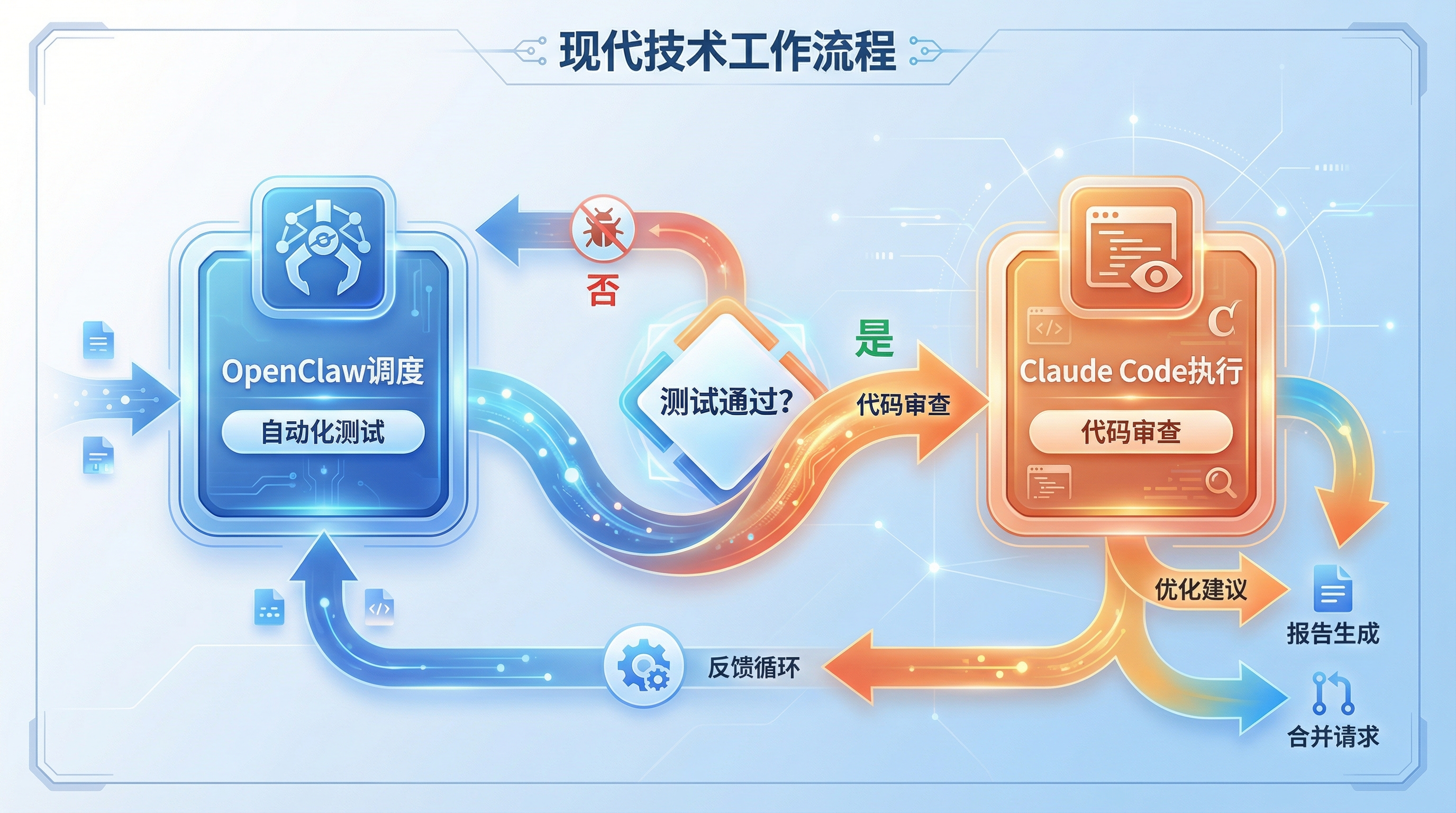 🚀 复杂项目开发:OpenClaw管理流程,Claude Code处理代码 🚀 CI/CD自动化:OpenClaw调度Agent,Claude Code审查代码 🚀 多文件重构:Claude Code分析,OpenClaw并行执行 🚀 测试与优化:OpenClaw自动测试,Claude Code智能优化